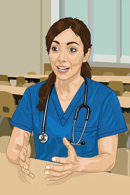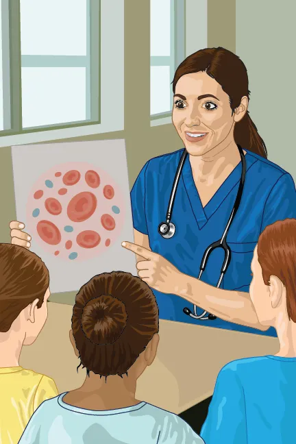 I was brought on with almost no visual direction — just a rough description of the main character, Nurse Florence, and full creative freedom to define the medium and style. After submitting an initial character concept for approval, I received the full manuscript: 18 illustrations, many with overlapping subject matter like "nurse explaining blood" or "nurse talking to kids."
